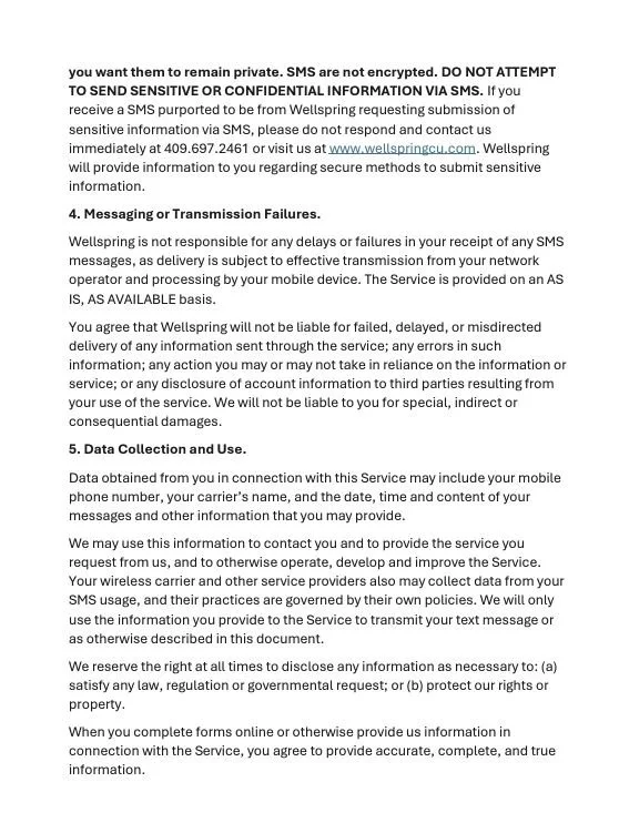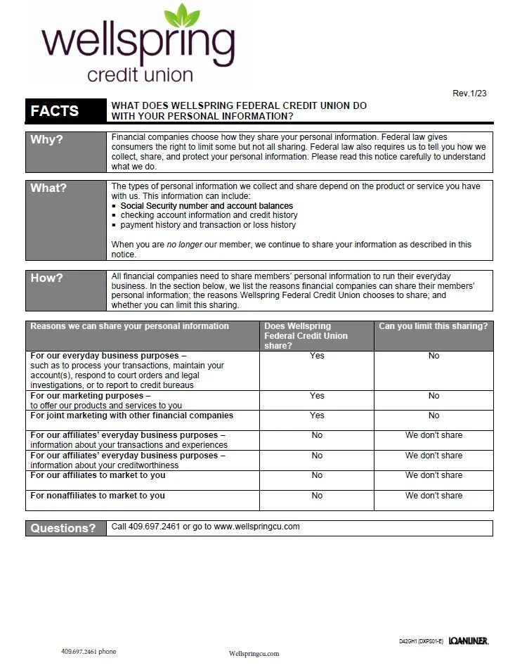 Wellspring Credit Union is committed to protecting members’ financial privacy. This Online Privacy Policy applies to Wellspring Credit Union’s webpages, Wellspring-branded social media sites, mobile applications, online banking applications, and digital advertising campaigns. Our web and digital properties do not intentionally target children under the age 13 without parental consent. In addition to the privacy practices described within this statement, social media sites and other third-party partners may have their own privacy policies that you should understand prior to using their services to interact with Website on those sites.